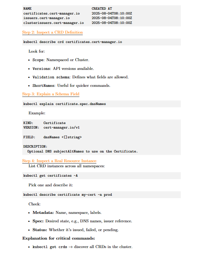 - CRDs : inspect schemas, validate custom resources.